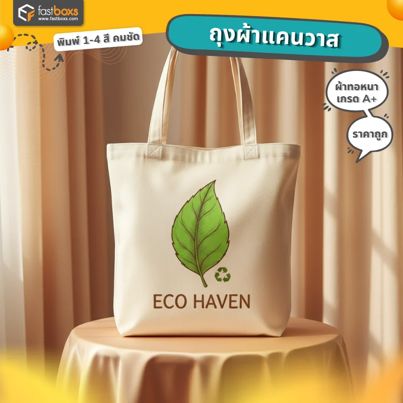 เราใช้ผ้าทอหนาเกรด A+ เนื้อผ้าหนาแน่น มองไม่เห็นของข้างใน พิมพ์ 1-4 สี ด้านเดียว อยากผลิตถุงผ้าแบบใช้งบน้อยแต่ได้งานคุณภาพต้องผลิตที่ Fastboxs